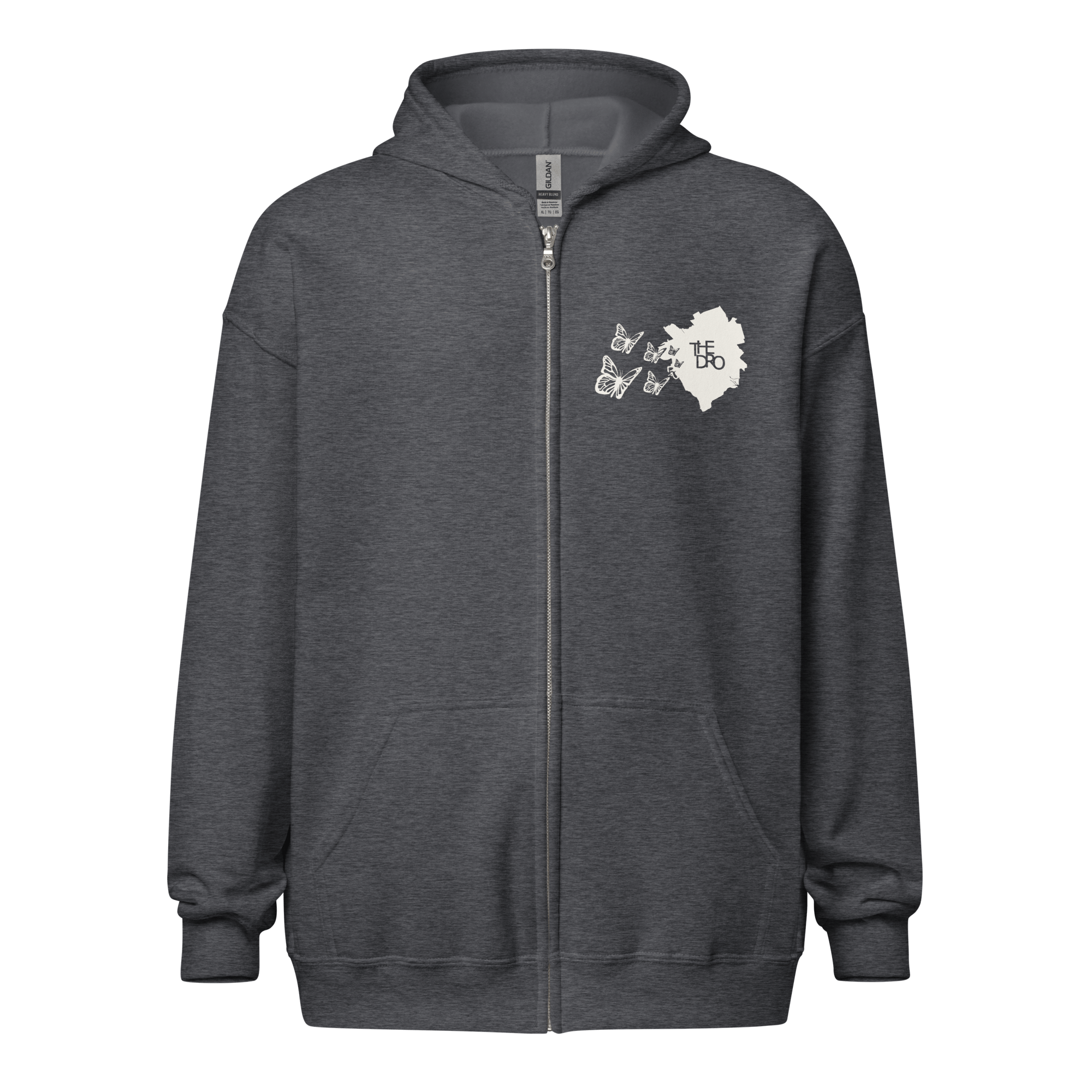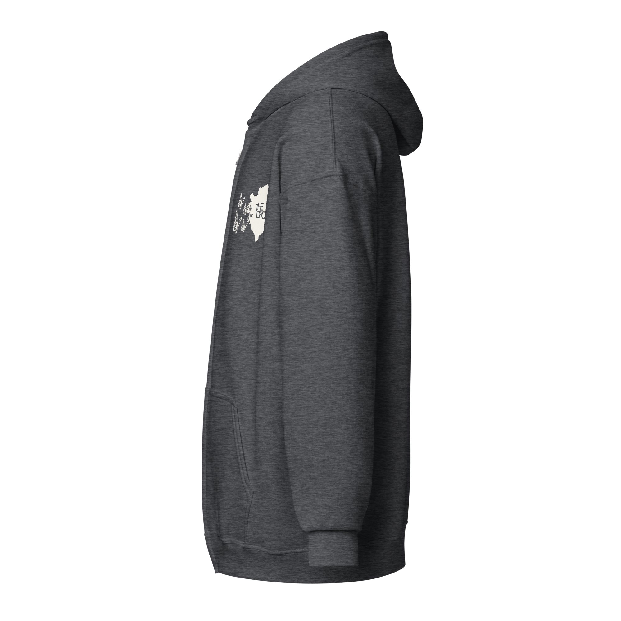 Our classic migrate design on your new favorite hoodie. This hoodie is made from soft fleece inside and outside, with a sturdy metal zipper, convenient front pockets, and a hood with color-matched drawstrings.